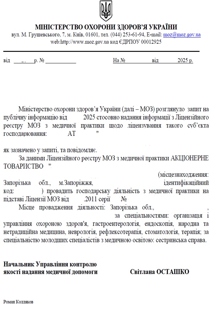 Отримання медичної ліцензії для приватних лікарських кабінетів та інших медичних установ.